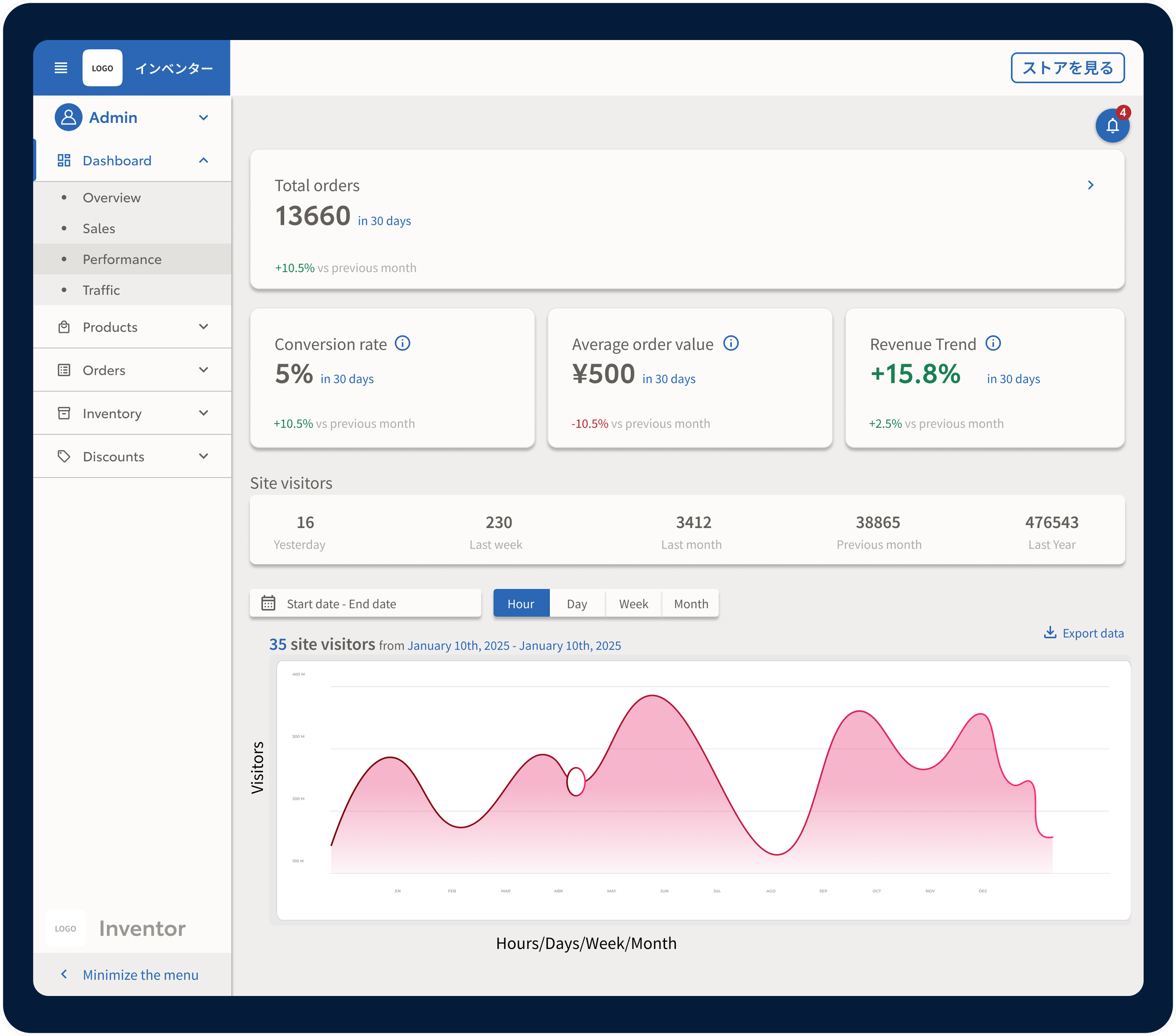 These dashboard analytics empower store administrators with clear, actionable insights. Sales performance data highlights revenue trends, order volumes, and average order values, while traffic analytics reveal visitor activity across different timeframes. Together, they help admins identify growth opportunities, optimize marketing strategies, and make informed decisions that improve store performance.