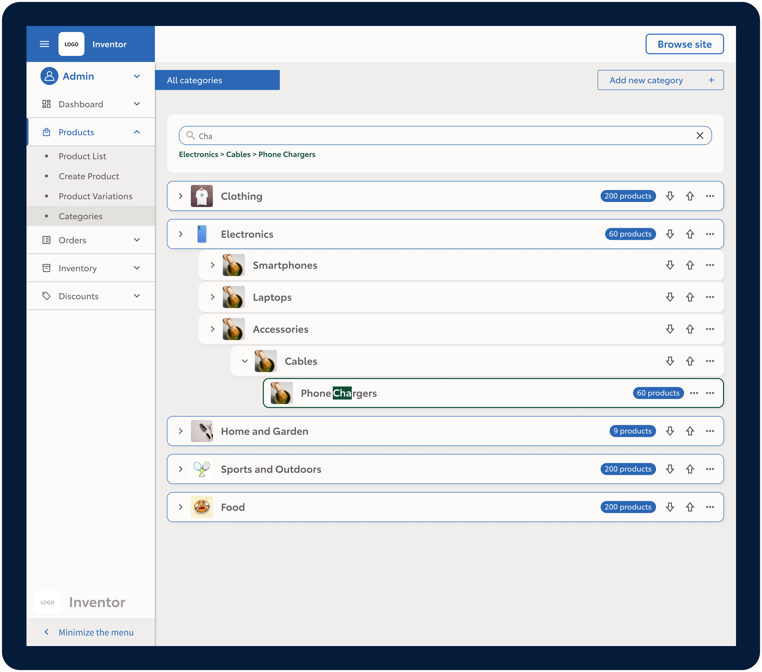 Category images & product counts → Visual cues and product totals help admins instantly understand the scope of each category.