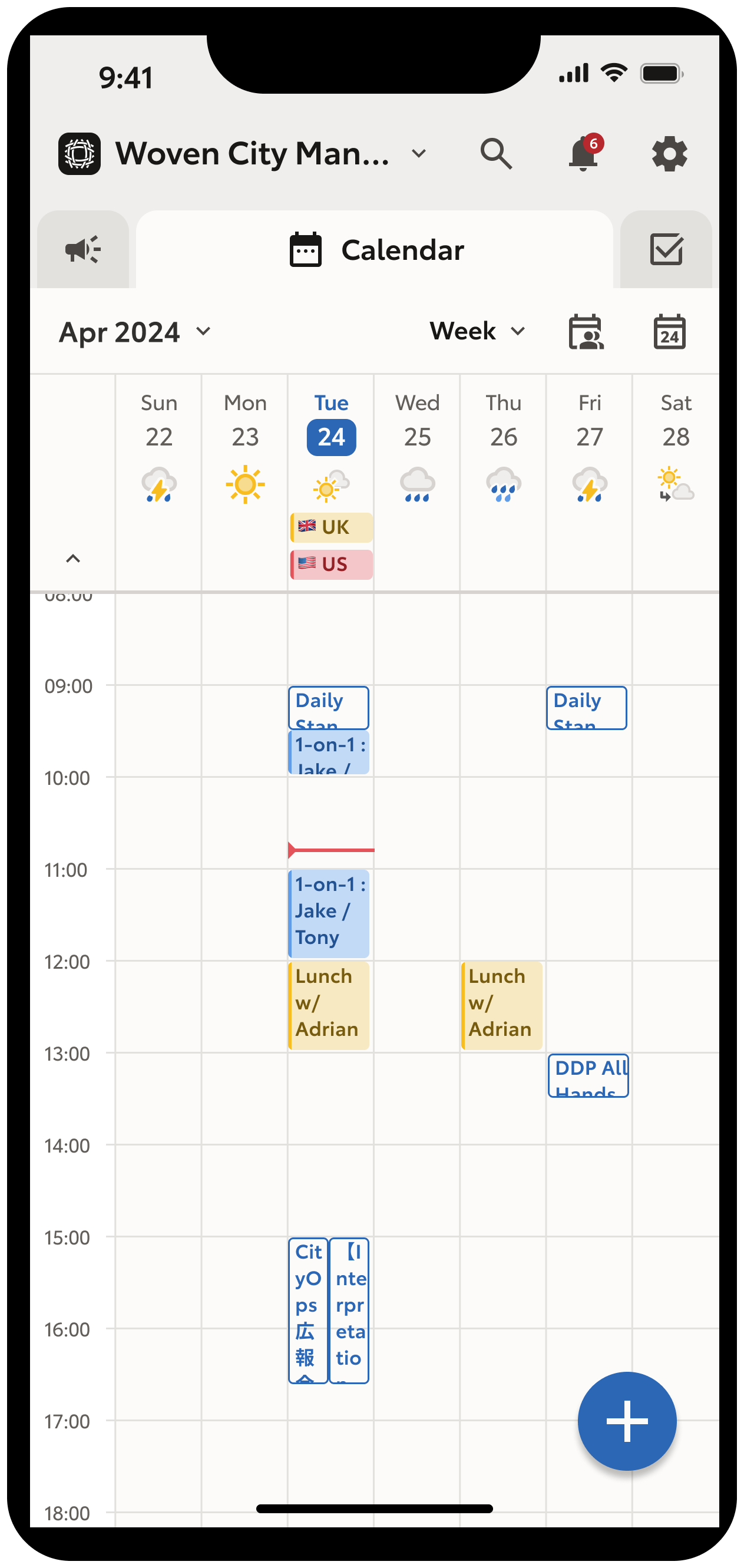 Calendar consolidates events (with weather and resources) and links back to tasks/announcements.