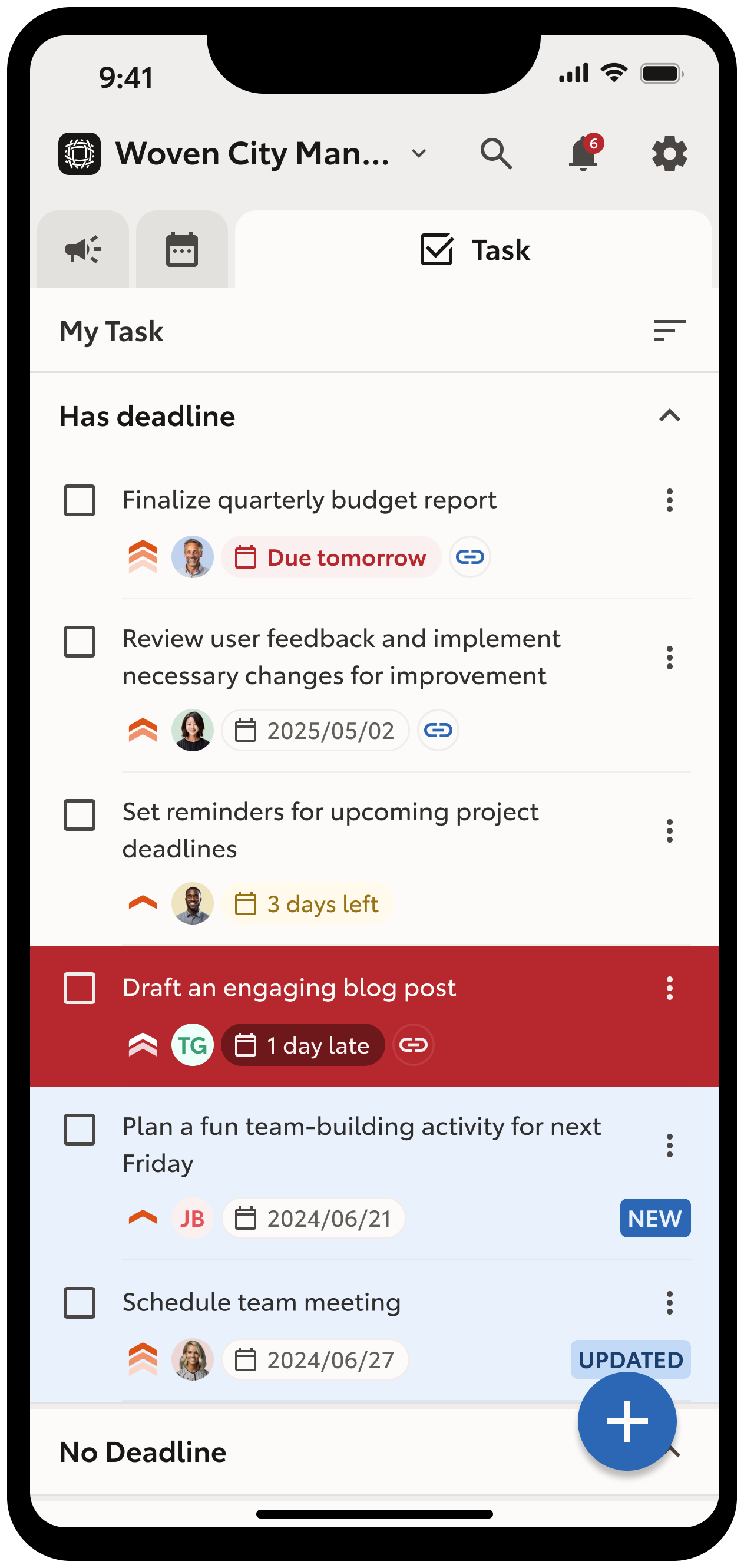 Task Prioritization (P1–P3) & Deadline Chips with overdue and updated indicators.