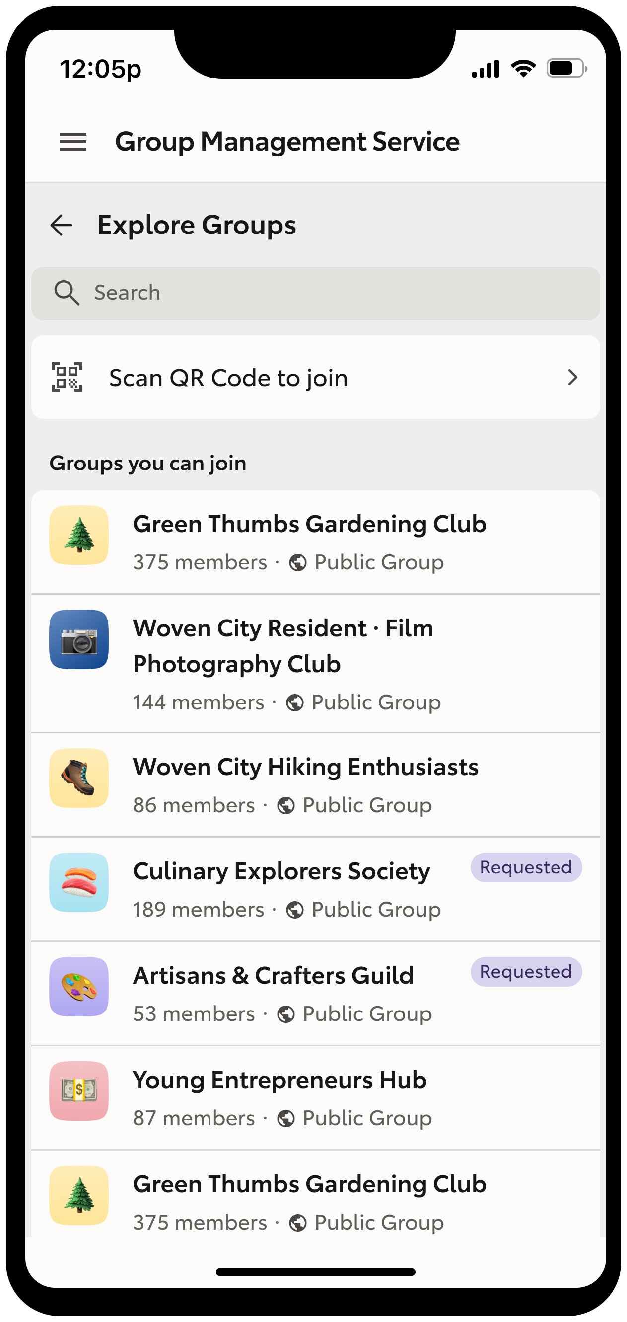 The Explore Groups screen makes discovering communities effortless with search, filtering, and clear group details like size and type. Users can also scan QR codes to instantly join a group, removing barriers to entry.